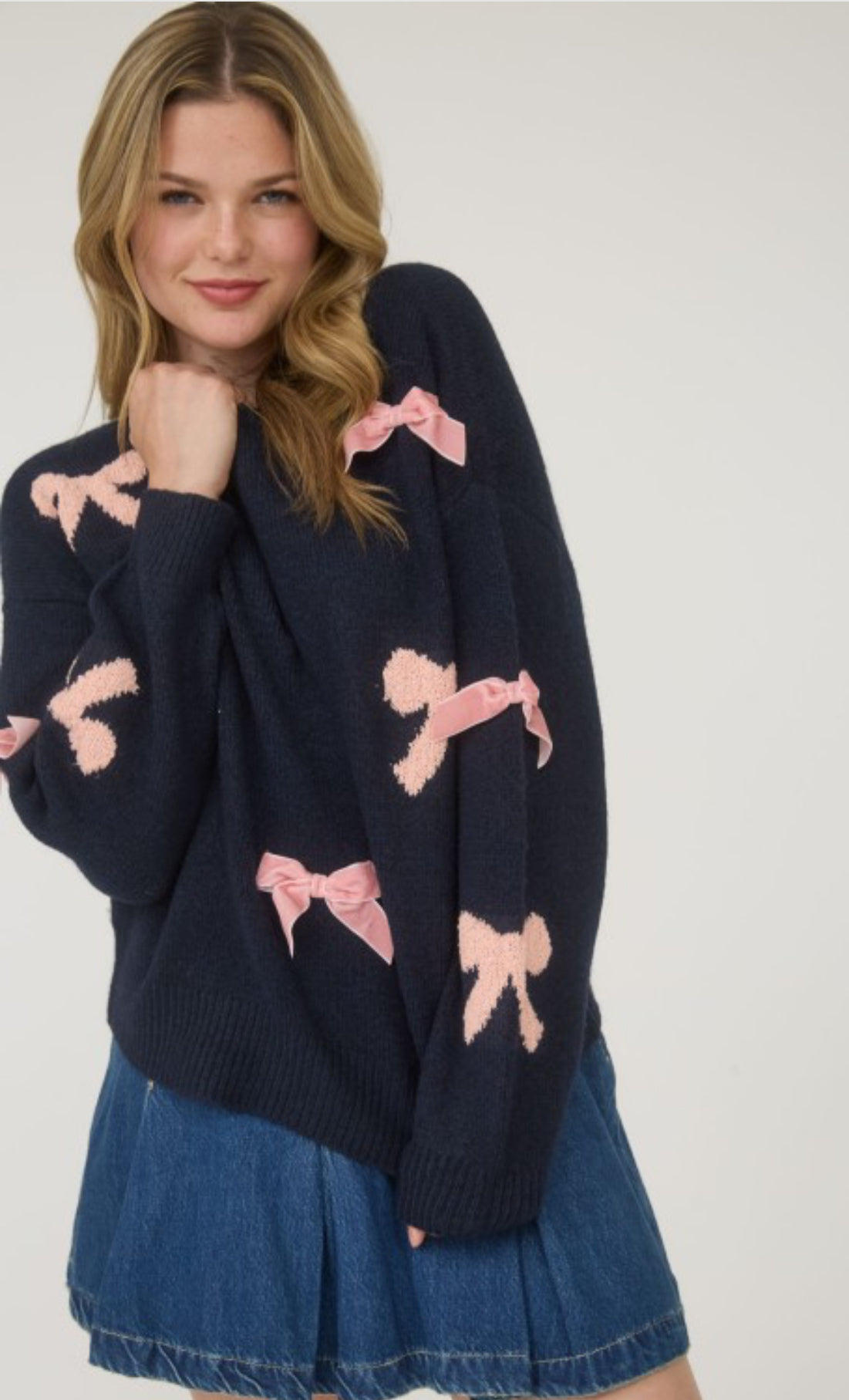 Cozy meets cute! 💕 This navy knit sweater with blush pink bow accents is the perfect mix of sweet + stylish. Pair it with your favorite denim skirt or jeans for that effortless fall-ready look. 🍂